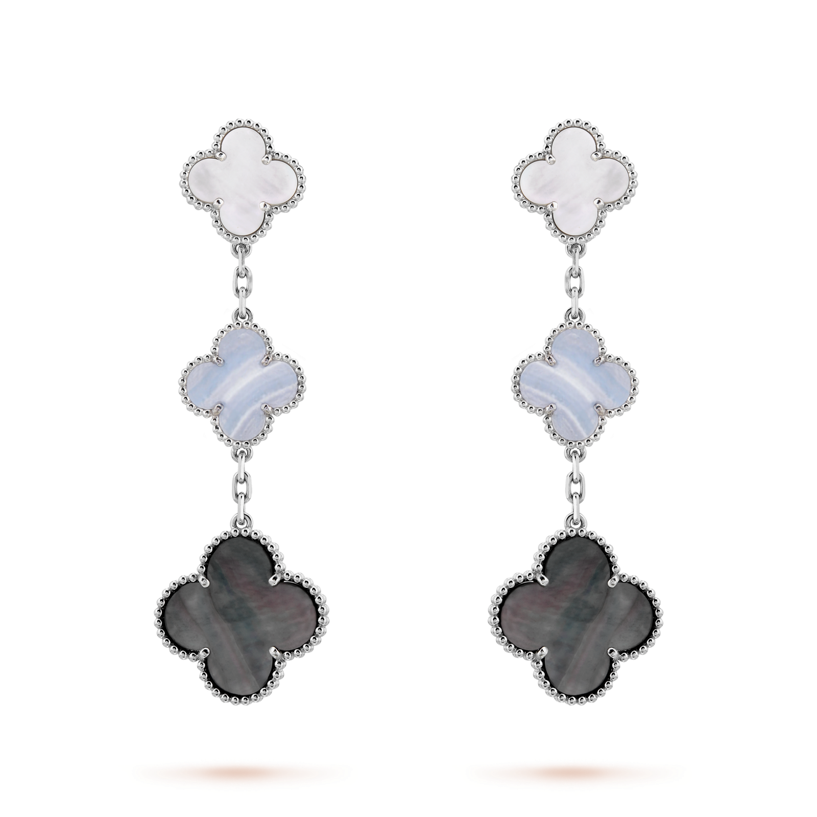 Magic Alhambra earrings, 3 motifs (White gold, Chalcedony, Mother-of-pearl)